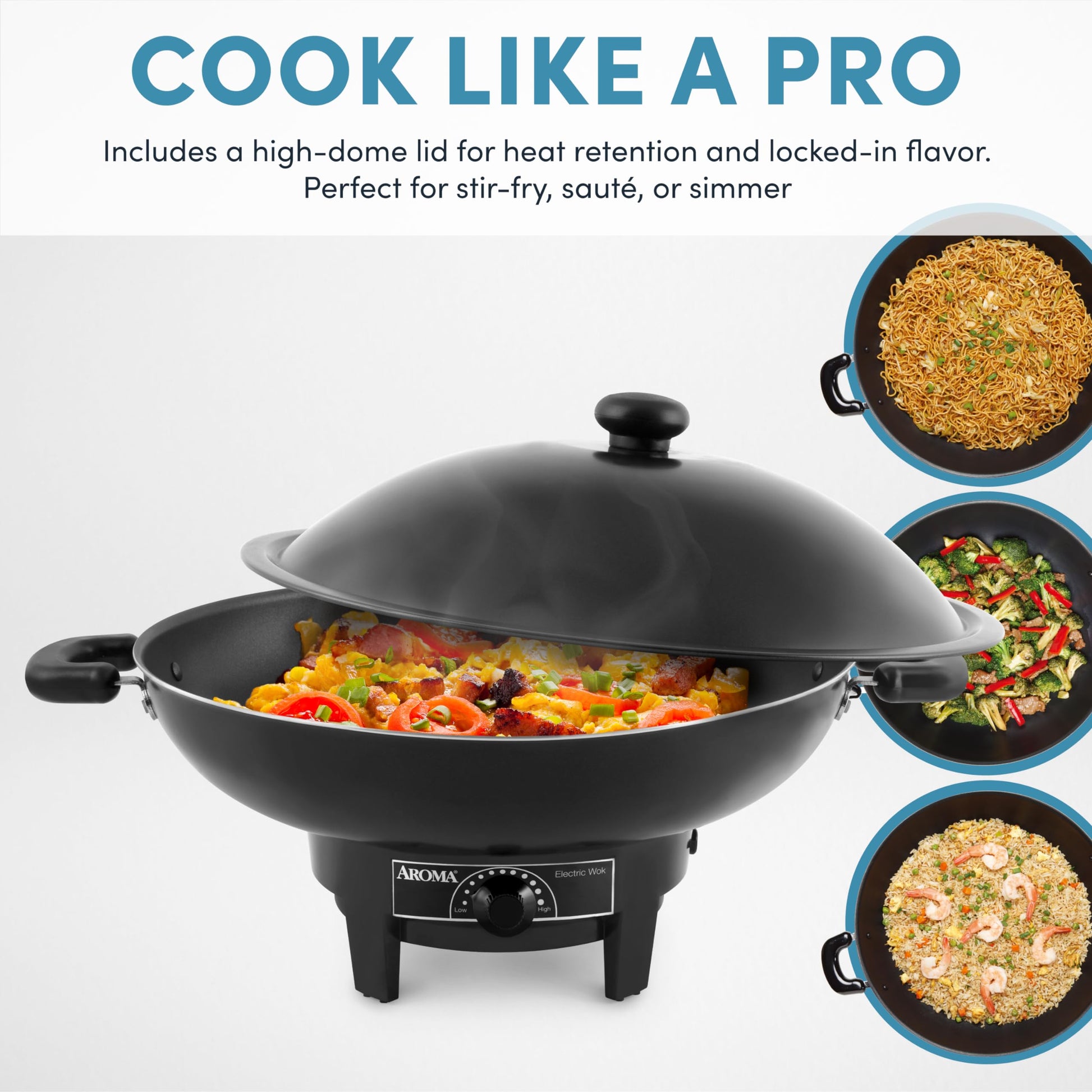 - COOK LIKE A PRO: The wok with lid is designed with a temperature probe that allows you to maintain a consistent temperature for even cooking. The lid is designed with a steam vent that allows you to control the moisture when cooking or steaming giving you the freedom to make stir fry, soups, fajitas, fried tempura, and much more