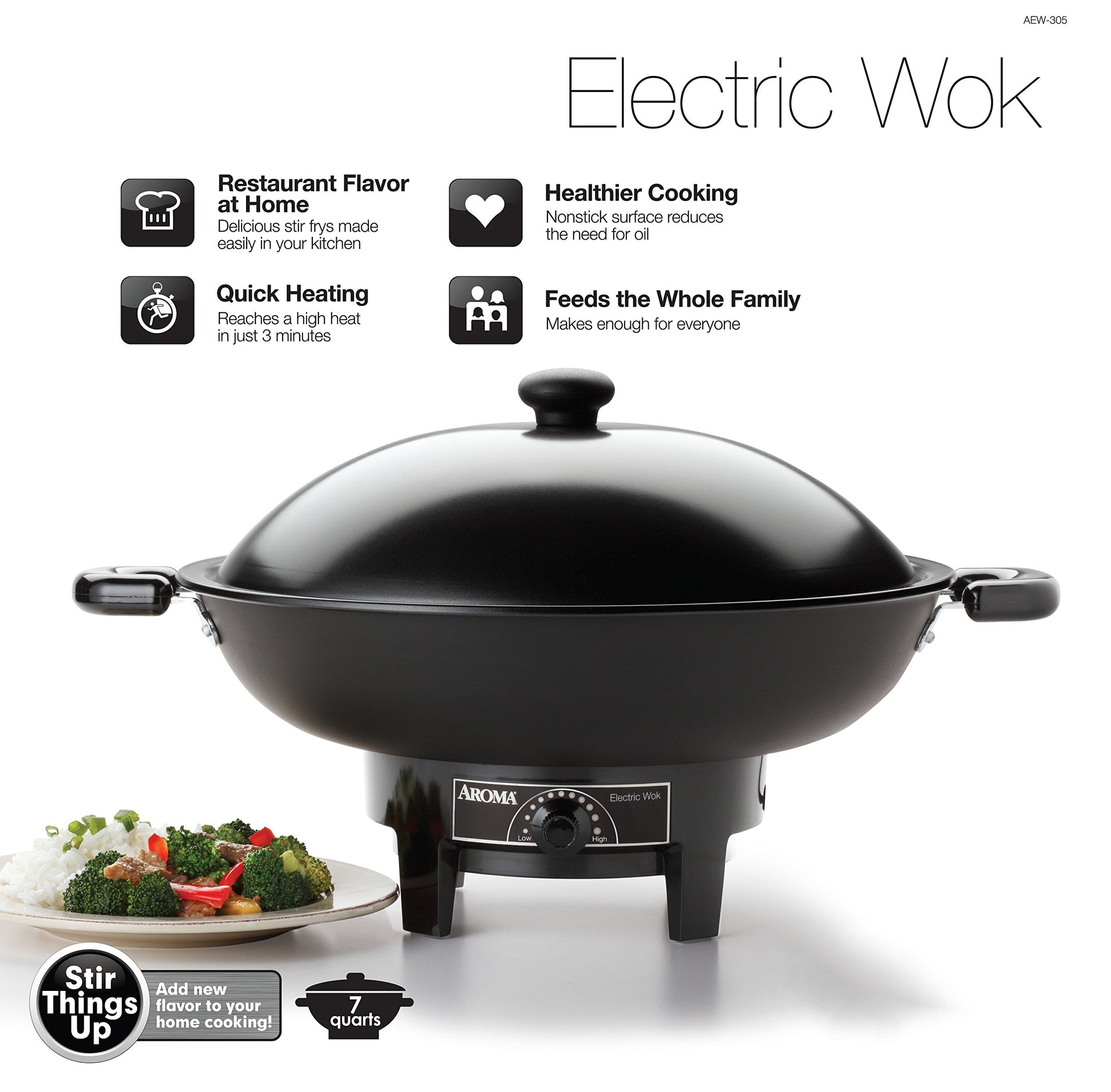 - THE COMPLETE WOK KIT: Our wok pan comes with everything you need to cook authentic Asian and modern dishes. Each pack comes with an AEW-306 wok, high domed tempered glass lid, extra-long chopsticks to help you cook along with a steaming rack and a tempura rack. Power Consumption : 120V 60Hz 1500W