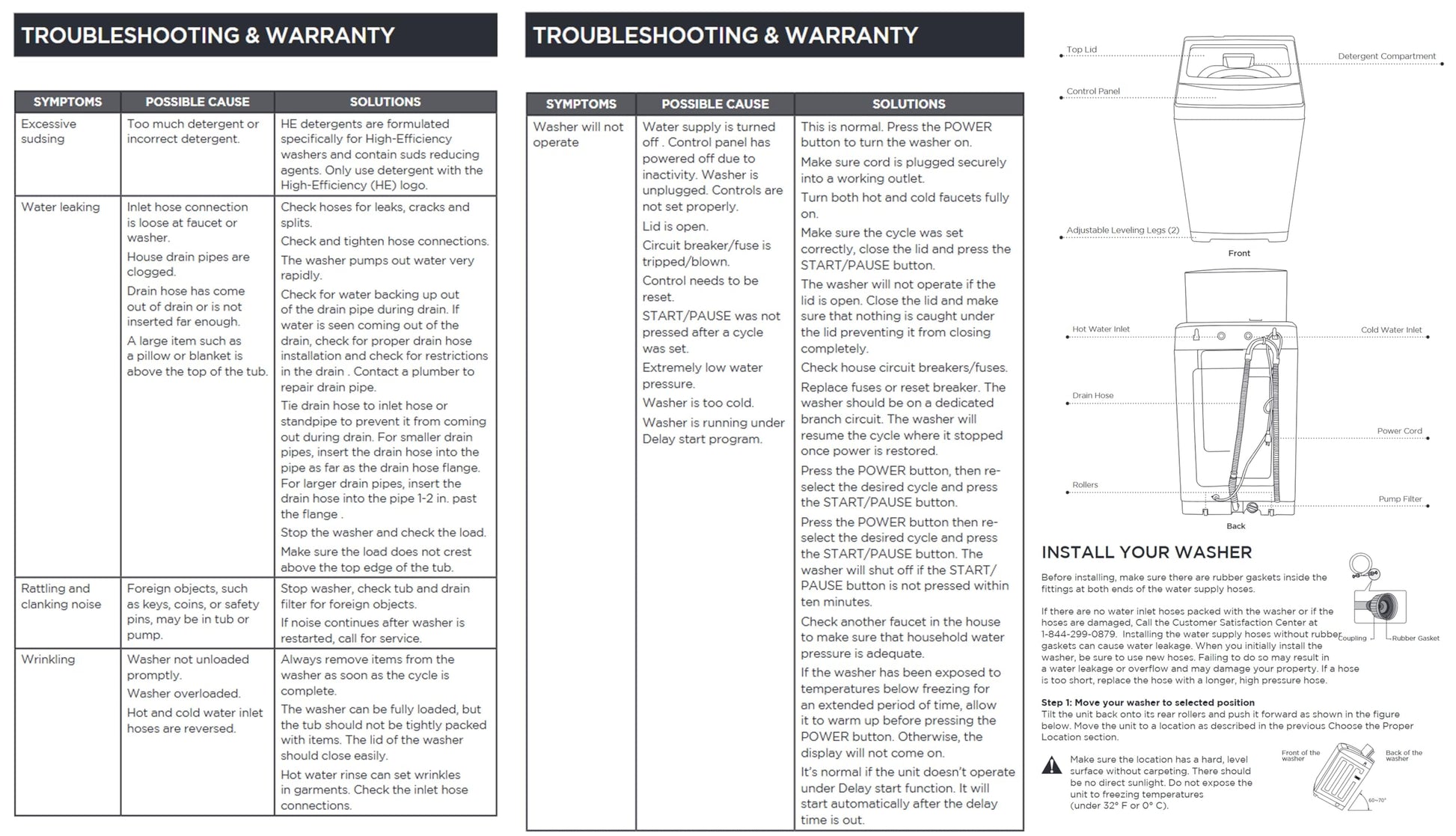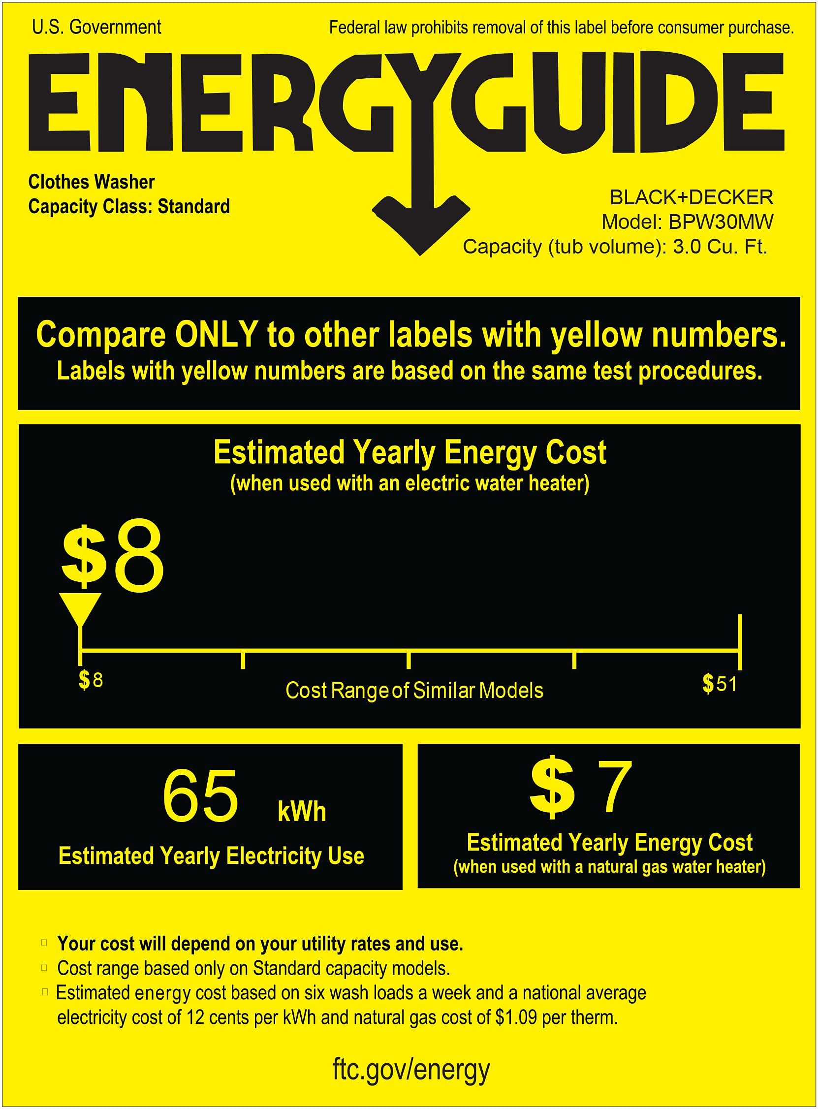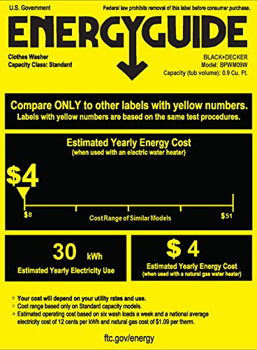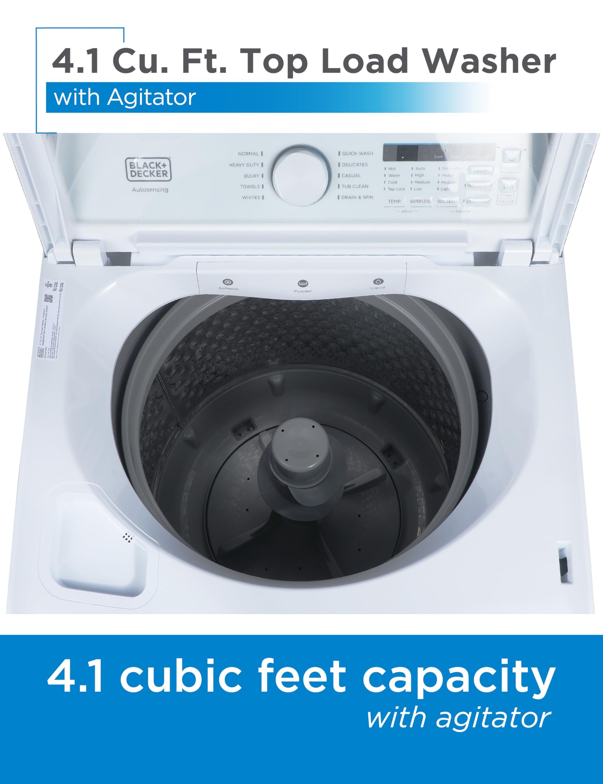 When it comes to washing machines, this outstanding BLACK+DECKER portable washer (17.3” x 17.7” x 31.1”) is your ultimate solution to immaculately clean clothing for household use. There are 5 cycles to choose from with this fantastic 0.9 cu. ft. washer, which include Heavy, Gentle, Normal, Rapid, and Soak. Cold water temperature settings available with three water level choices for small, medium, and large loads. Inside this small washer (48.4 lbs.), you’ll find an incredible stainless steel tub that’s rust and corrosion-resistant with a quiet close top loading transparent lid. Because this unit is an impeller washer, it’s perfect for lingerie and delicates as it doesn’t have an agitator to cause entanglement problems. Also, you can use for soiled baby clothing and diapers, but must run them separately from other loads. You can also easily wash baby clothing and diapers, as well as lingerie without entanglement problems common with agitator washers. Place anywhere in your home or area with 2 rollers, 2 side handles, and 1 adjustable front leveling leg. This unit comes with a drain hose and quick connect sink adaptor. Also included are auto shutoff safety features and Child Lock protection. Get the high quality washing you deserve to live out your day with our amazing BLACK+DECKER portable washing machine. Reinforced packaging is included for total customer satisfaction.