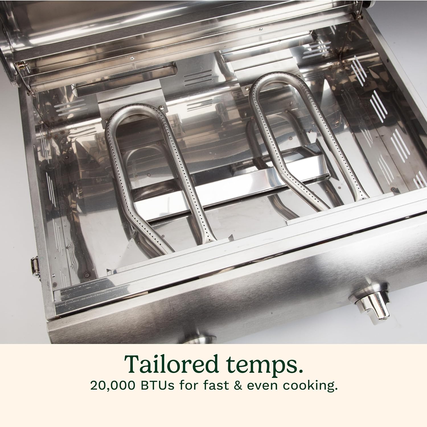 Get the best of both worlds with the Cuisinart Chef’s Style Tabletop Grill—a powerful portable gas grill that combines the performance of a full-sized barbecue with the portability you need for on-the-go grilling. With 20,000 BTUs of grilling power and 275 sq. in. of cooking space, this camping grill can sear meats and cook delicious meals for family and friends. The BBQ grill has two independently controlled burners that let you create separate heat zones for perfectly grilling a variety of foods at once. The built-in thermometer allows you to monitor the portable grill's temperature with precision, while the sleek stainless steel finish adds a touch of style. Perfect for camping adventures, beach outings, and weekend cookouts, the Cuisinart Chef’s Style Tabletop Grill ensures you can grill like a pro wherever you go.