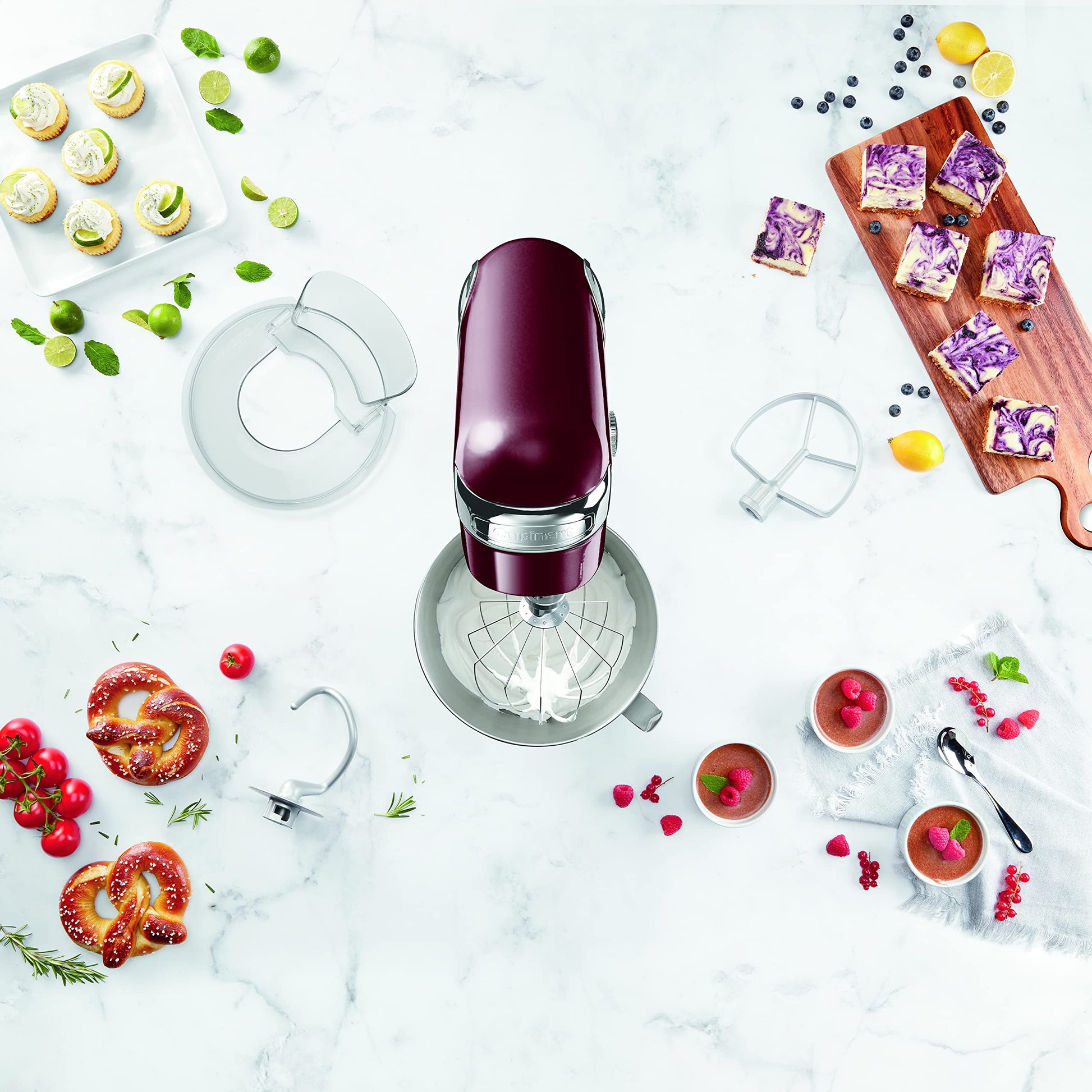 - INCLUDED: Chef’s whisk, dough hook, flat mixing paddle, and splash guard with pour spout – also included is an instruction manual and recipe book