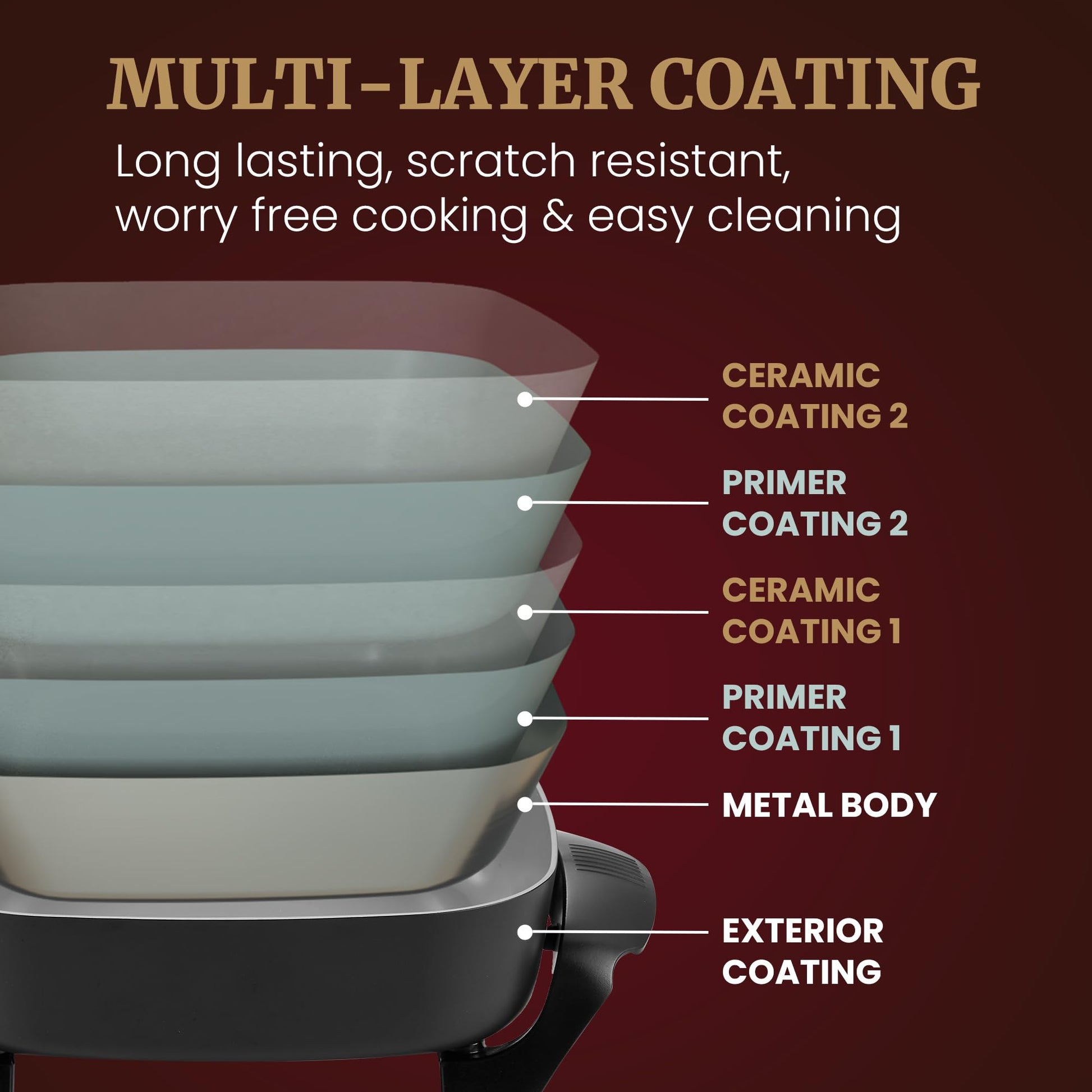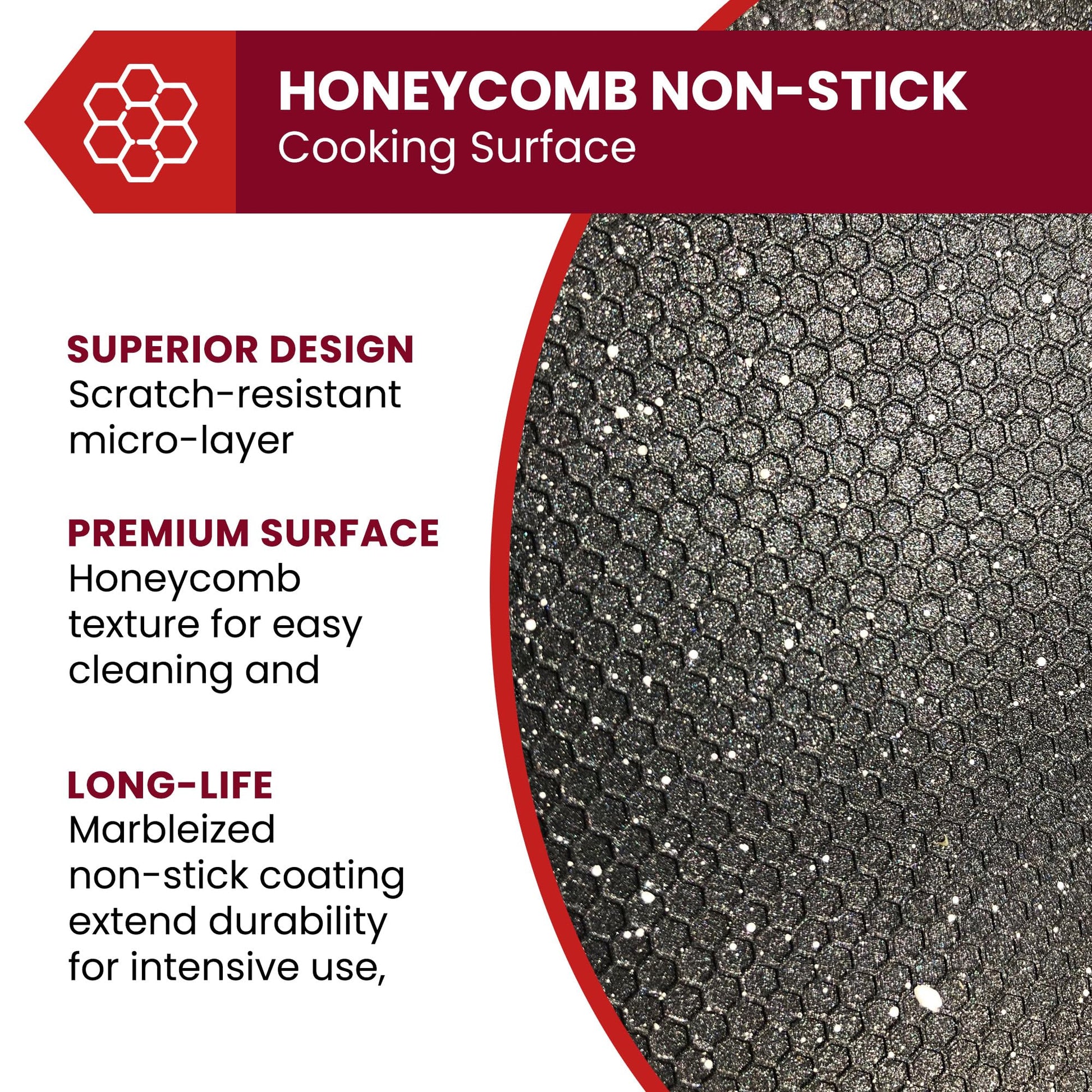 - Marbleized honeycomb non-stick is more durable than non-stick and will not crack or peel. It quickly releases food for a no-fuss quick and easy clean up. Scratch resistant surface allows for worry-free cooking!