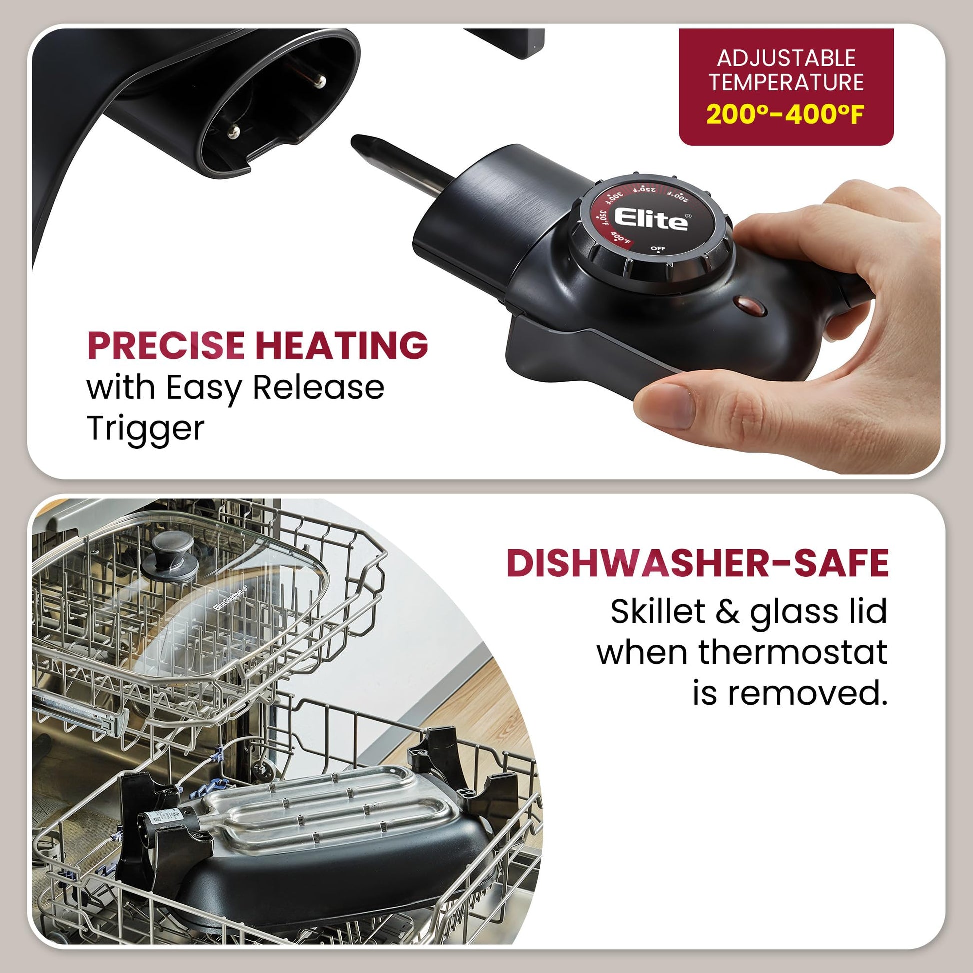 - RAPID + EVEN HEAT from our fully-embedded M-shaped heating element. With its Trigger-Release control probe, you can pinpoint temperatures of 200-400°f degrees and prevent hot spots and scorched food.