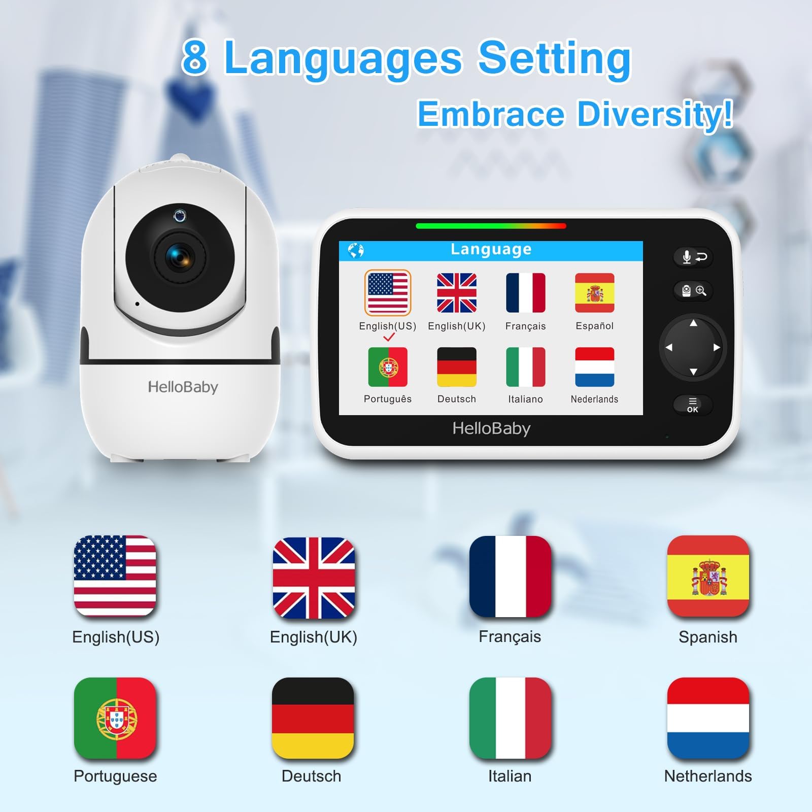 - Loved Baby Monitor Features: The crystal clear Two-Way Audio feature allows conversation both ends as clear as if you were in the same room with your little one. Room Temperature Monitor and Alert, Night vision, 8 Lullabies, Sound Level LED Indicator, Audio only Saving Power Mode, Tabletop or Wall Mounting Options, Multi-Camera Expandability (up to 4 cameras), Date/Time on the Screen, ideal for baby register, baby shower, new parent.