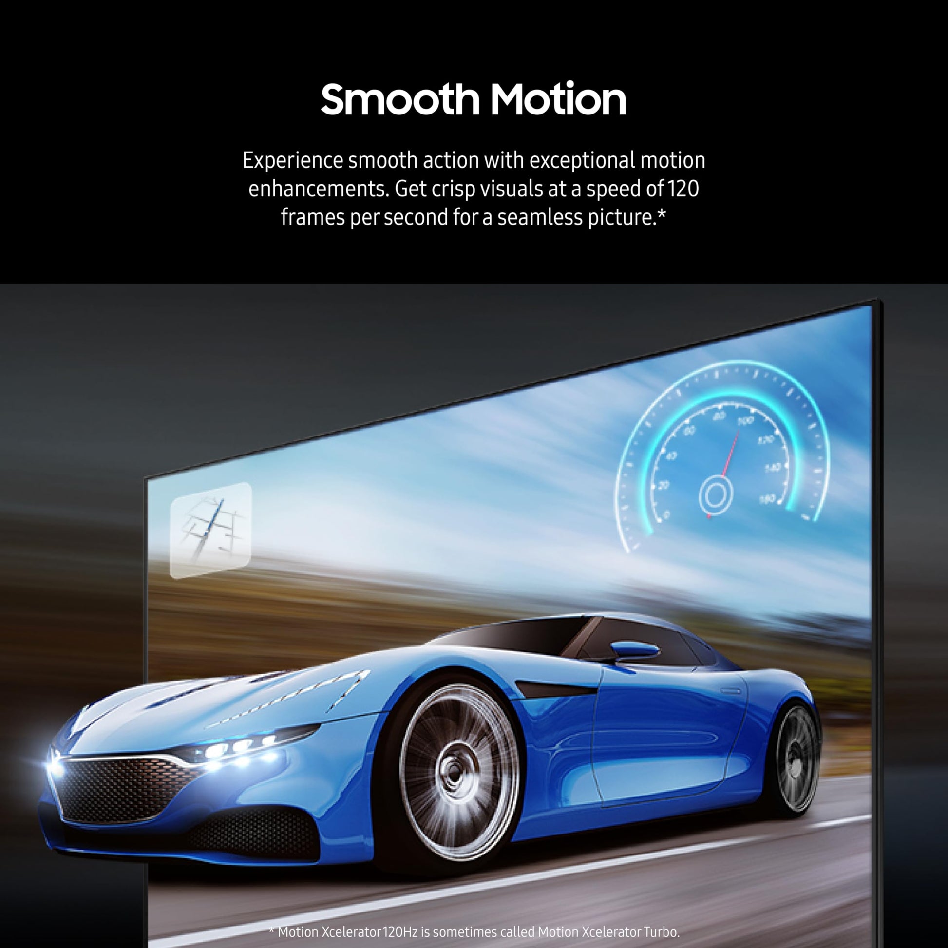¹Utilizes AI-Based formulas. ²Motion Xcelerator 120Hz is sometimes called Motion Xcelerator Turbo. ³Q-Symphony requires compatible 2020-2024 Samsung TV and either a Q-series or S-series soundbar. ⁴Samsung Account required for network-based smart services, including streaming apps and other smart features. Separate [connected] computer, mobile or other device may be necessary to create/log in to Samsung Account (free to download and create). Without Account log in, only external device connections (e.g., via HDMI) and terrestrial/over-the-air TV (only for TVs with tuners) available. ⁵High speed internet connection, additional gaming service subscriptions, and compatible controller required. Game Bar UI is subject to change without prior notice.