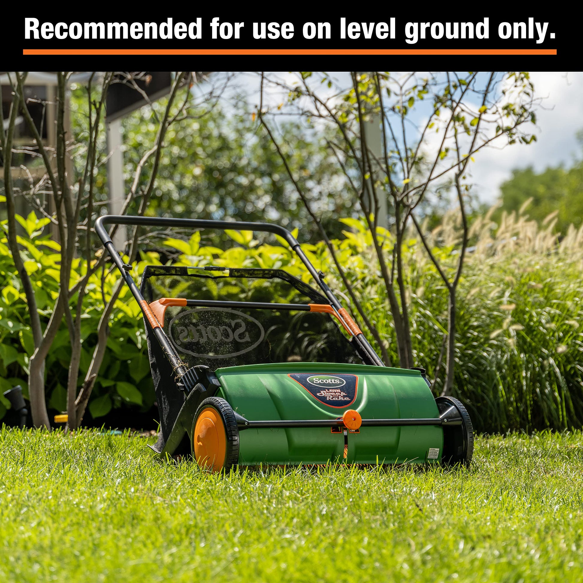 - Scotts Lawn Sweeper recommended for level ground only. The push sweeper has a spinning rake like brush action to clean your lawn, patio, yard, sidewalk, and driveway
