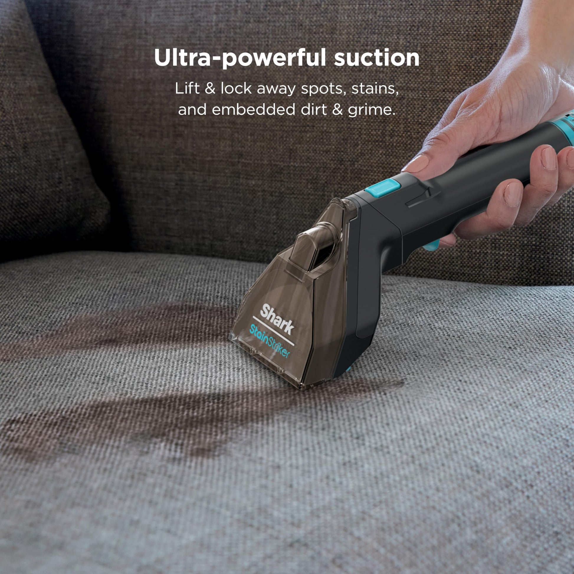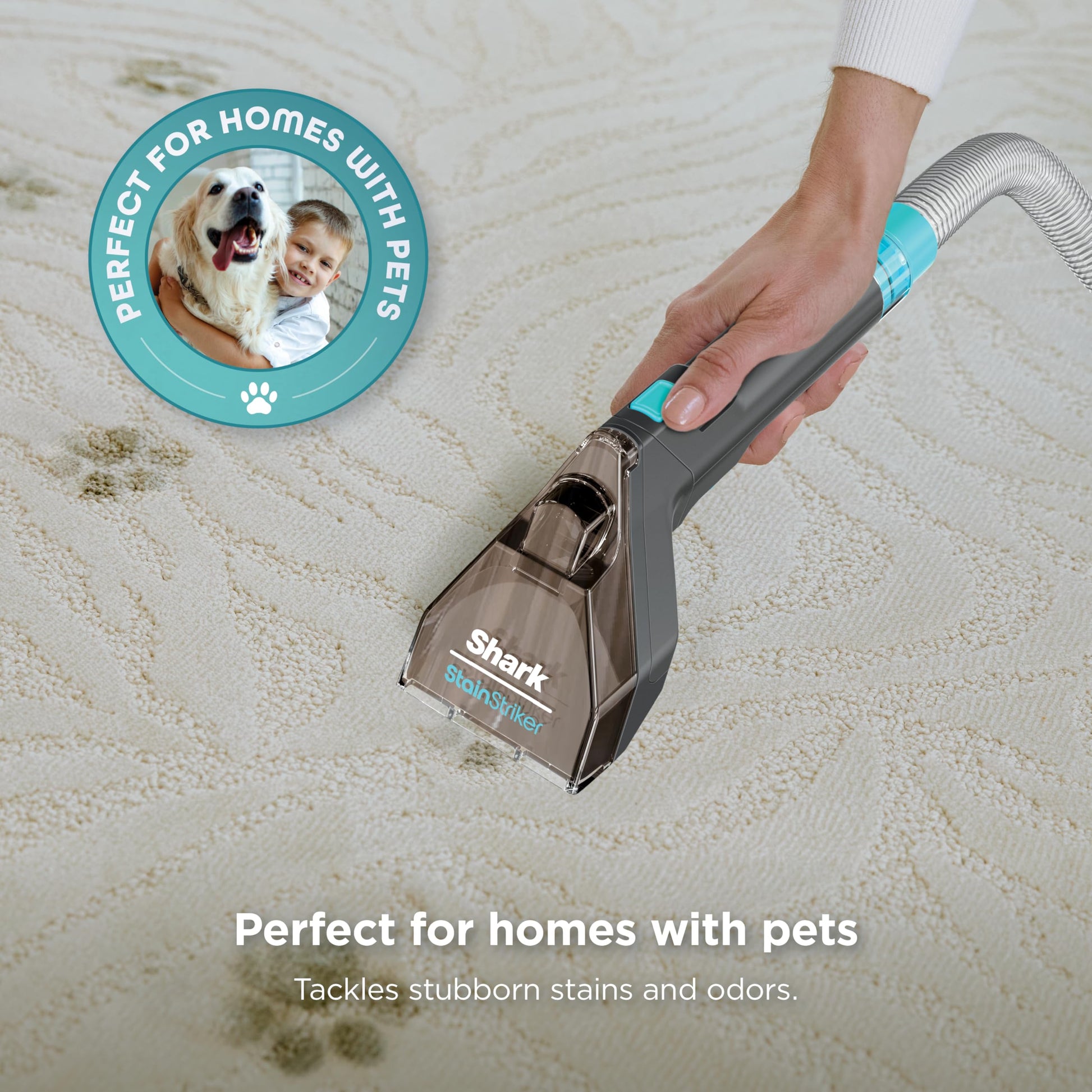 - Shark StainStriker is a portable carpet and upholstery cleaner with the pet mess extractor that combines dual-activated formula and ultra-powerful suction to remove embedded spots and stains – perfect for pets, car interiors, and whole-home cleaning.