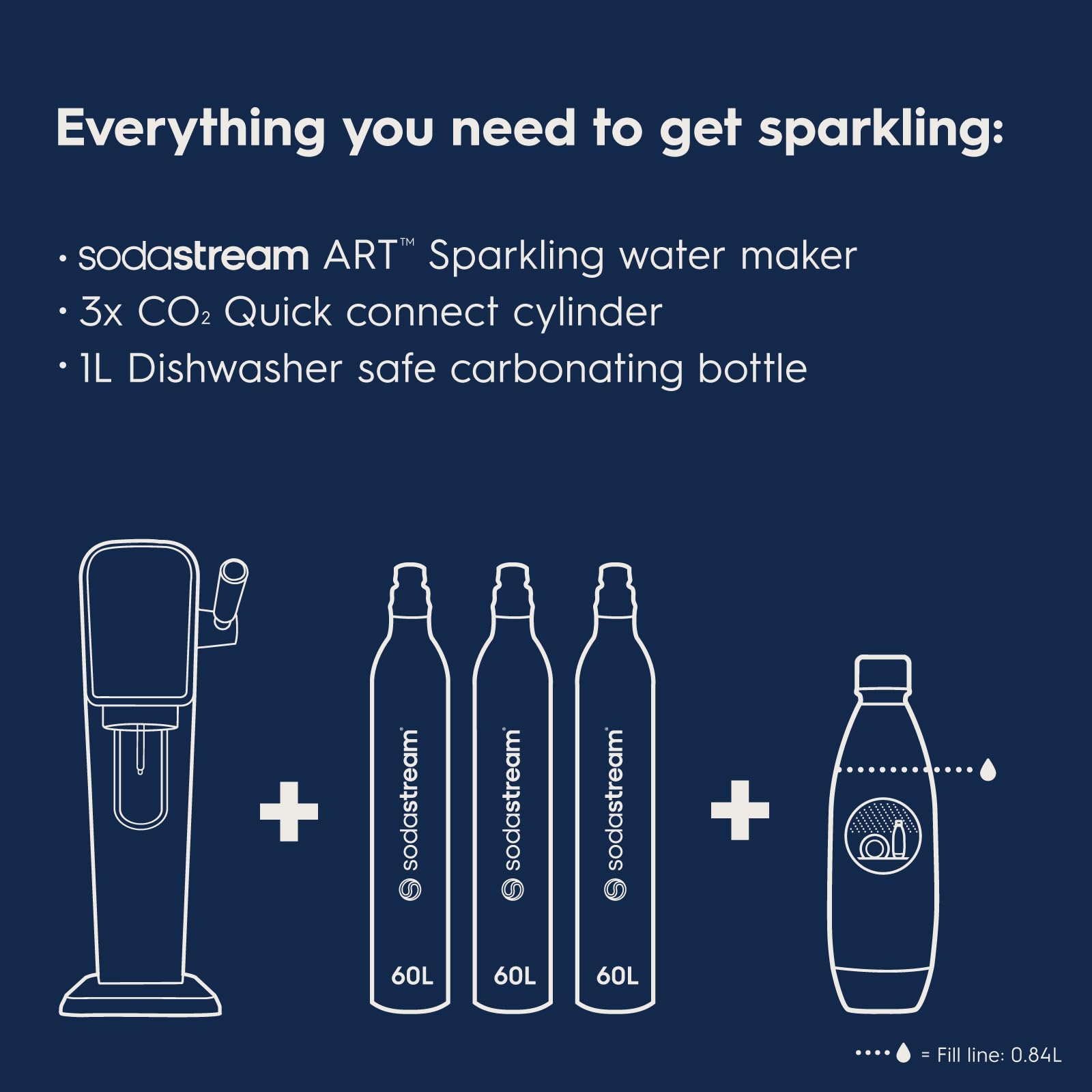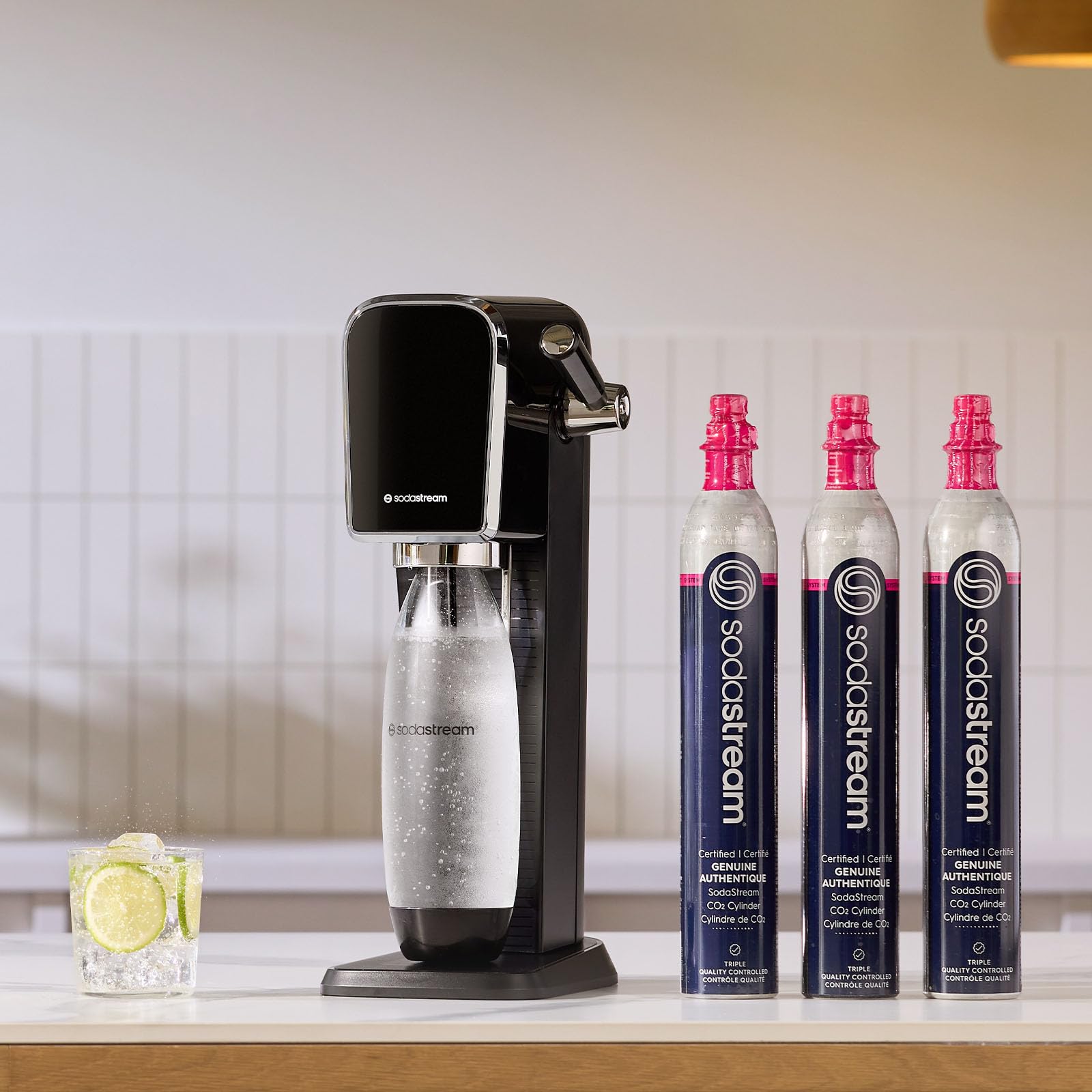 - ๐ฟ Enjoy eco-friendly carbonation with the SodaStream ART; powered by reusable CO2 cylinders, each cylinder carbonates up to 16 gallons of water, the equivalent of 120 plastic bottles; reduce your carbon footprint while enjoying endless sparkling drinks at home