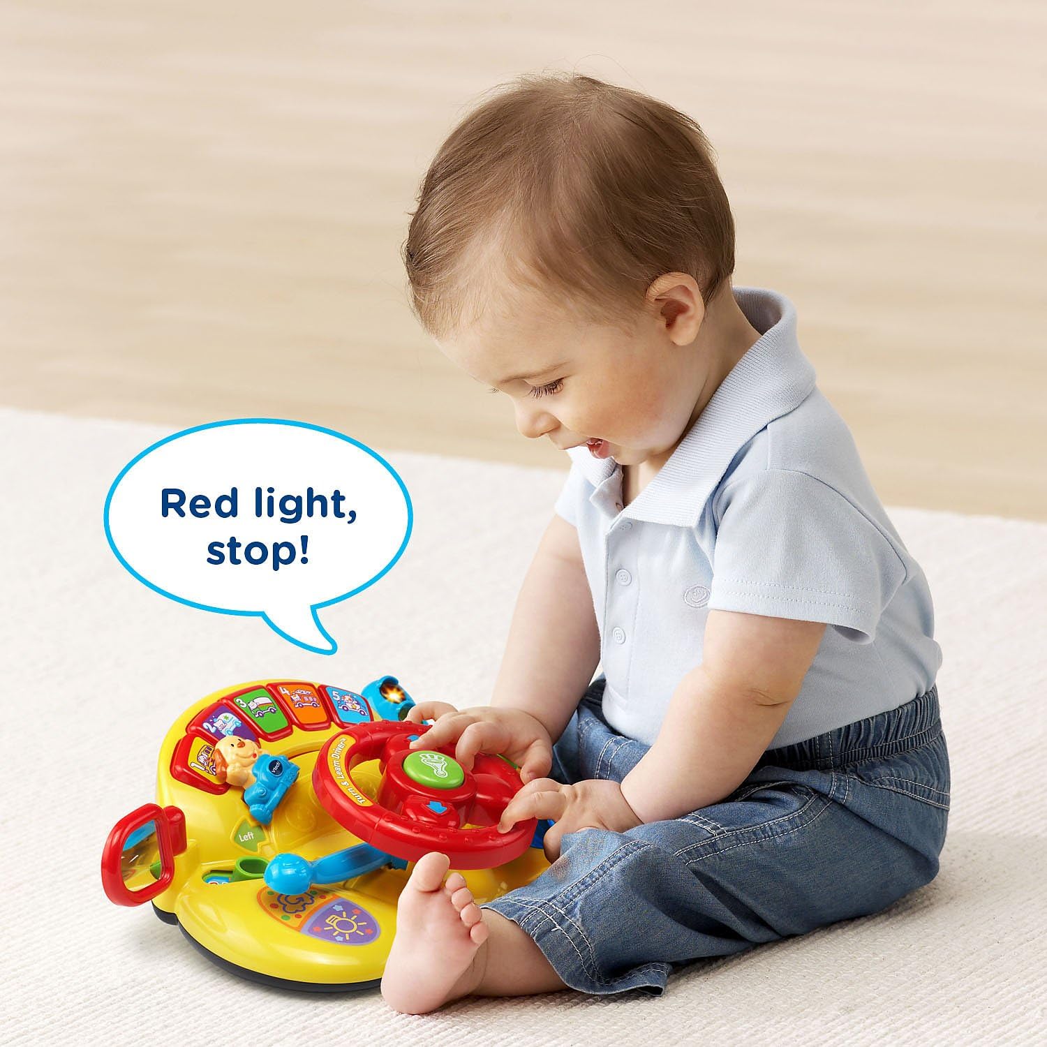 - Little hands eager to explore can turn the steering wheel and press colorful buttons to discover animals, vehicles and sounds with over 60 songs and phrases